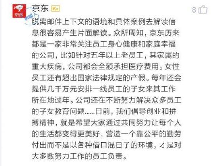对此京东回应称,脱离邮件上下文容易产生片面解读,倡导创业和拼搏,就是为了营造公平环境。