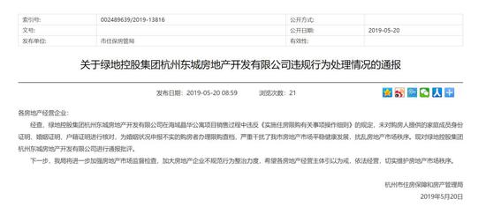 2019年5月份,绿城杭州东城房地产因在华家池印项目的销售中出现违规而遭到通报。