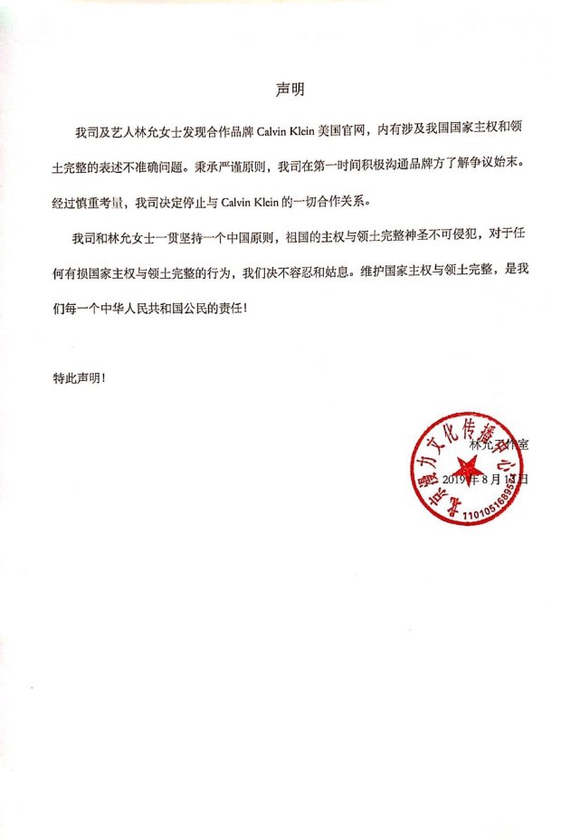 据悉,由林允代言的品牌CALVIN KLEIN被曝出美国网站上对于中国香港地区的分类存在争议。随后CALVIN KLEIN官博发文致歉,称将会即时修正并再次检查所有与中国领土描述相关的信息的准确性。